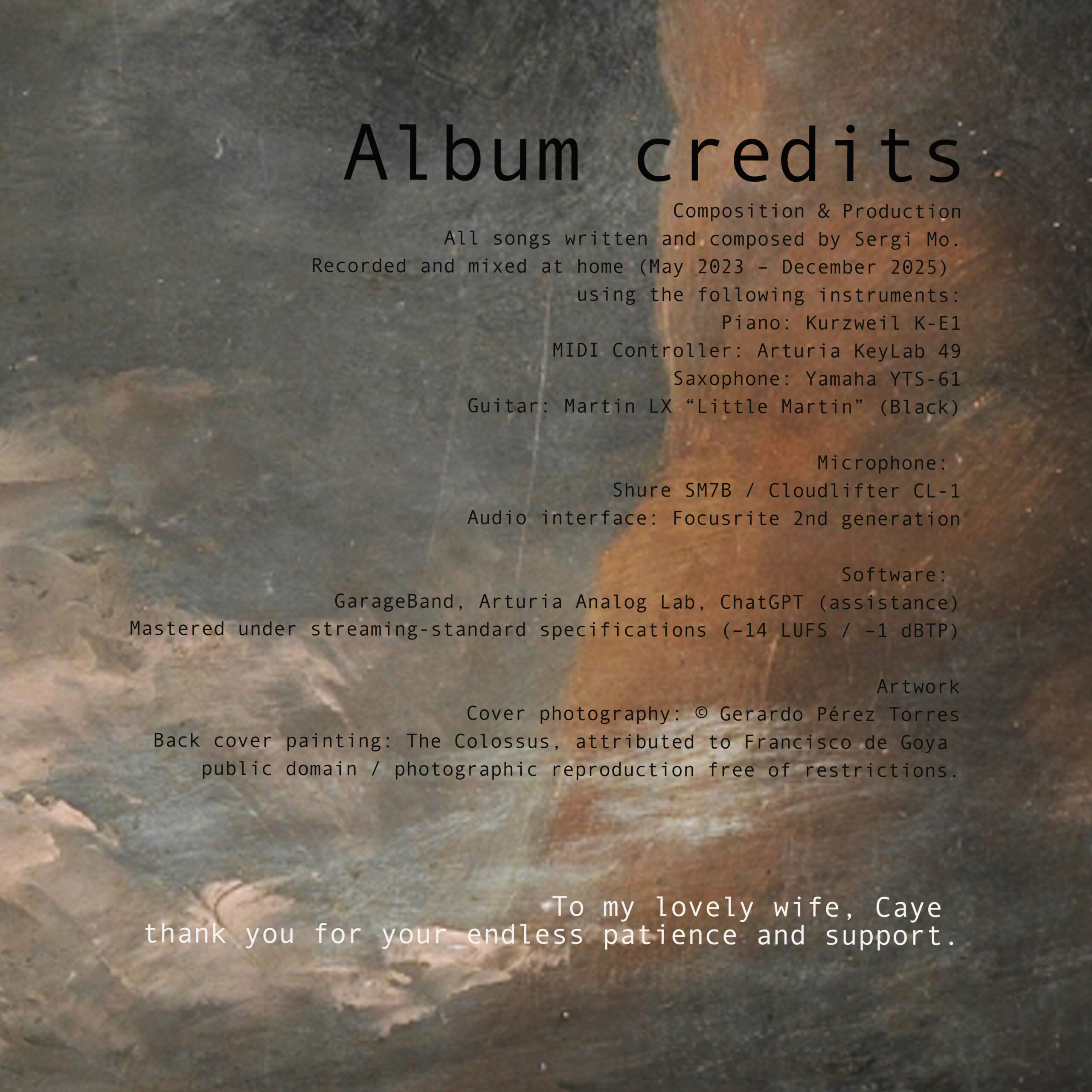 Compuesto y grabado en casa durante más de dos años y medio, el álbum mezcla austeridad digital con detalles orgánicos: respiración de saxofón Yamaha, la intimidad seca de una Little Martin, bocetos de piano en un Kurzweil y la textura inconfundible de una producción casera llevada a su forma más precisa. Cada tema fue creado despacio, de manera deliberada, como un pequeño acto de disección: ¿qué queda cuando eliminas el ruido, la narrativa y la autoilusión?